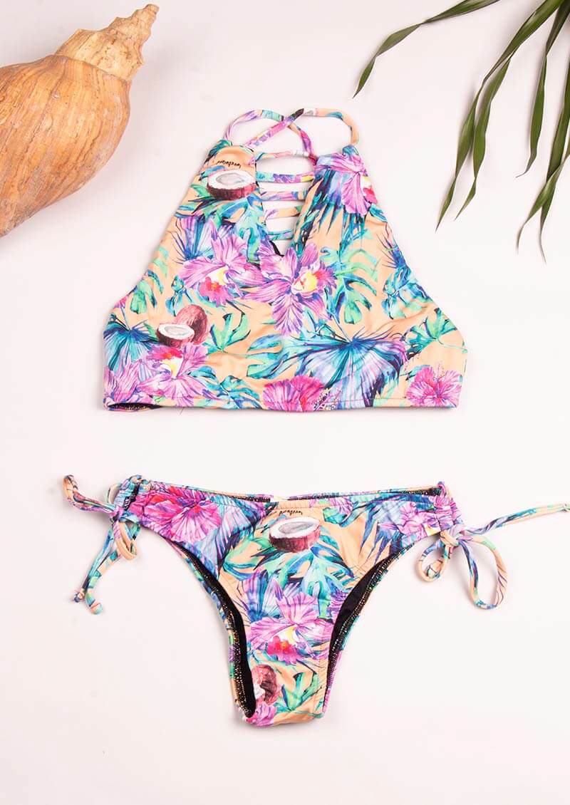 O modelo de biquíni boardsport está de volta no nosso site em uma versão muuuito melhor! Ele é super firme e foi desenvolvido especialmente para você praticar os esportes que mais ama: surf, skate, longboard, stand up paddle, nadar, ou usar como top para correr, ir para a academia, fazer pilates ou praticar yoga. Para você se sentir segura e confortável dentro e fora do mar. Agora ele possui um detalhe no decote para dar aquele charme, além da amarração na parte de trás do top não agredir a cervical e não deixar marcas indesejáveis do sol. Na calcinha ele continua sendo mais larguinho e mais firme e agora pode ser ser ajustado conforme o seu corpo. Com a estampa floral relax em tons de coral com vários elementos que amamos.