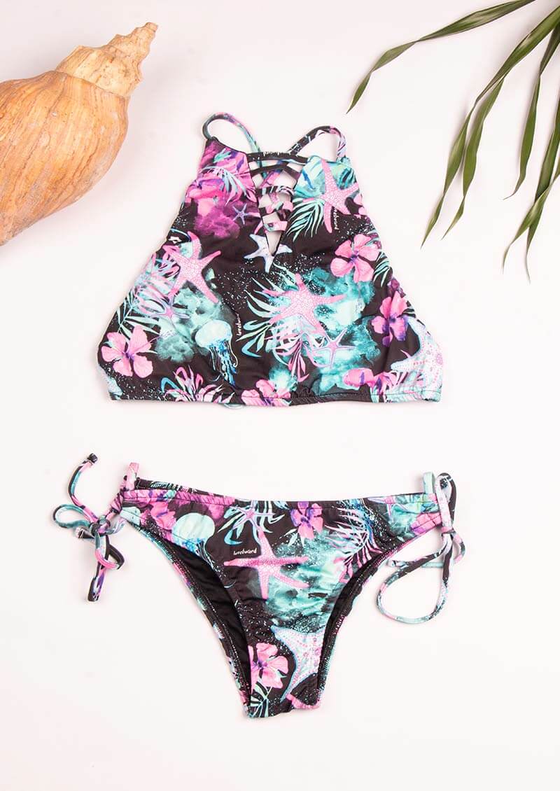 O modelo de biquíni boardsport está de volta no nosso site em uma versão muuuito melhor! Ele é super firme e foi desenvolvido especialmente para você praticar os esportes que mais ama: surf, skate, longboard, stand up paddle, nadar, ou usar como top para correr, ir para a academia, fazer pilates ou praticar yoga. Para você se sentir segura e confortável dentro e fora do mar. Agora ele possui um detalhe no decote para dar aquele charme, além da amarração na parte de trás do top não agredir a cervical e não deixar marcas indesejáveis do sol. Na calcinha ele continua sendo mais larguinho e mais firme e agora pode ser ser ajustado conforme o seu corpo. Com a estampa salty dreams em preto e com vários elementos que amamos.