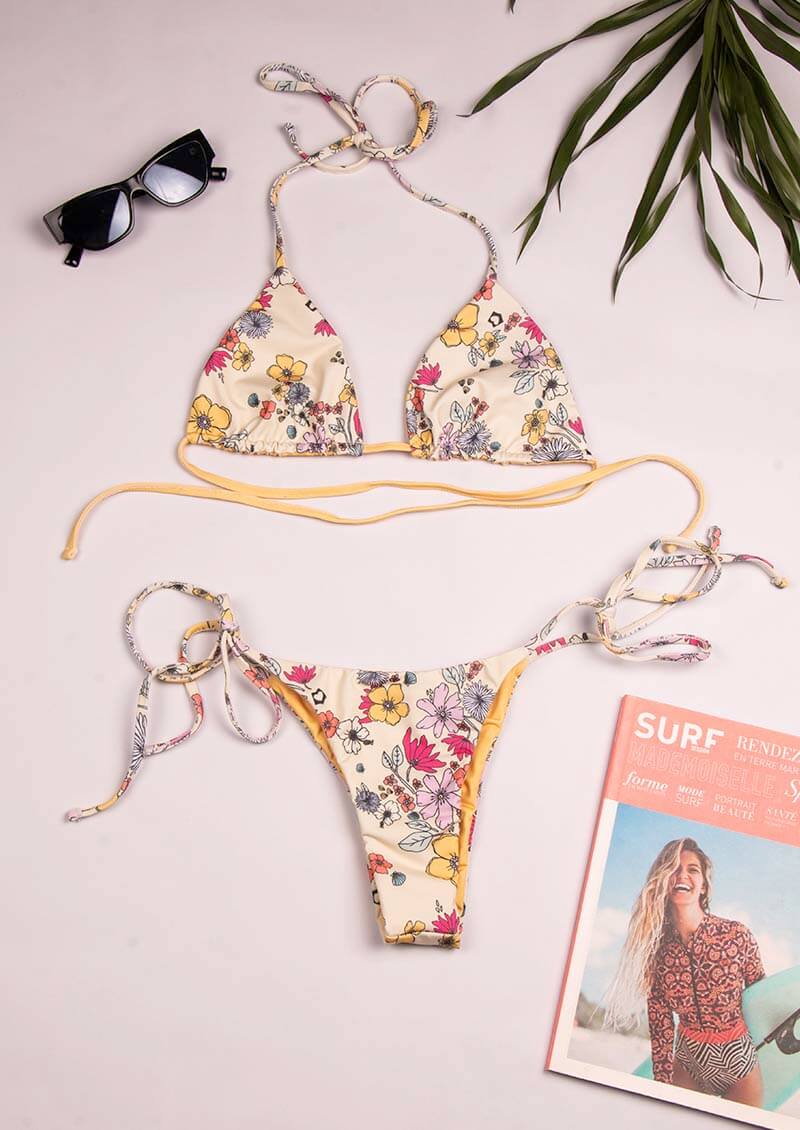 Biquíni cortininha de amarrar dupla face. Ele é estampado com o nosso floral amarelo retrô de um lado e amarelo liso do outro. O tecido é transpirável e possui tecnologia dry, que seca mais rápido, possui também proteção UV50+, produzido de forma responsável, com certificação OEKO-TEX, garantindo que não químicos nocivos ao usuário.
