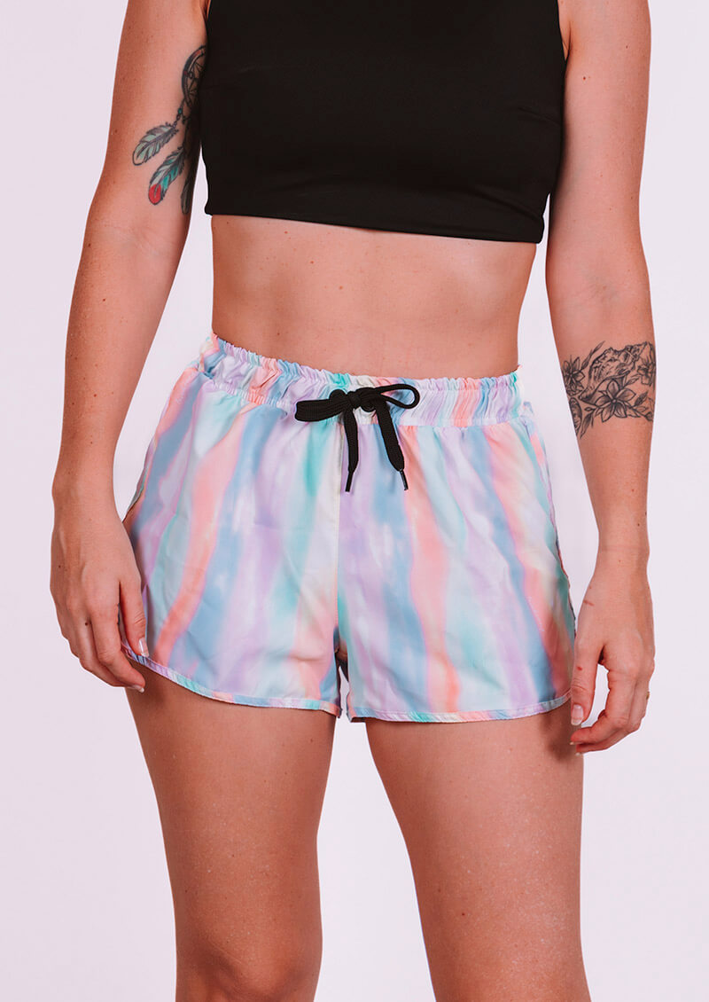Shorts de tactel com a estampa de tie dye colorida de listras, que é super alto astral e ao mesmo tempo transmite uma leveza. Perfeita para o verão com esses tons suaves e super refrescantes que combinam com várias cores de biquínis, tops e body e blusas.