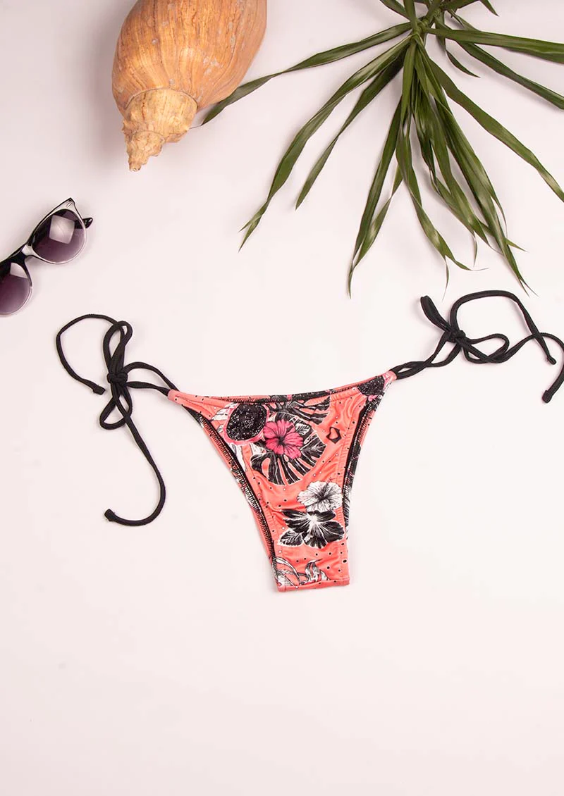 Calcinha de biquíni modelo cortininha estampado com as tirinhas de amarrar em preto que são super firmes e deixam com aquela marquinha linda de sol. Com forro em preto, ideal para não sujar com protetor e bronzeador.