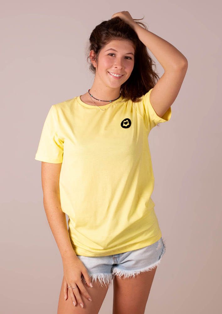 Camisetão unisex amarelo com malha ecológica e produzida de forma responsável, sem gerar resíduos nocivos ao meio ambiente e sem químicos prejudiciais à saúde.