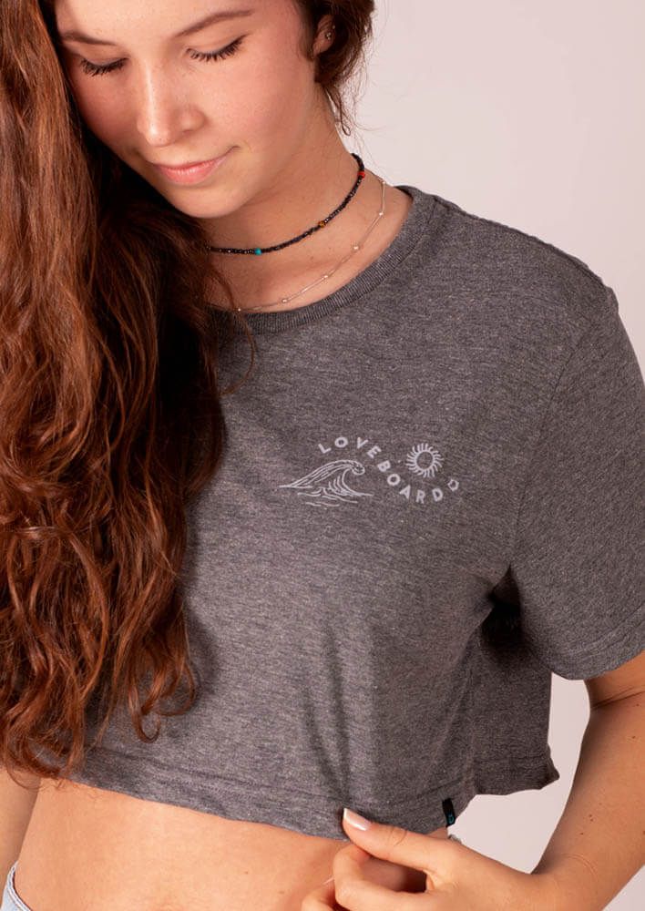Cropped mescla feito com malha ecológica e produzida de forma responsável, sem gerar resíduos nocivos ao meio ambiente e sem químicos prejudiciais à saúde.