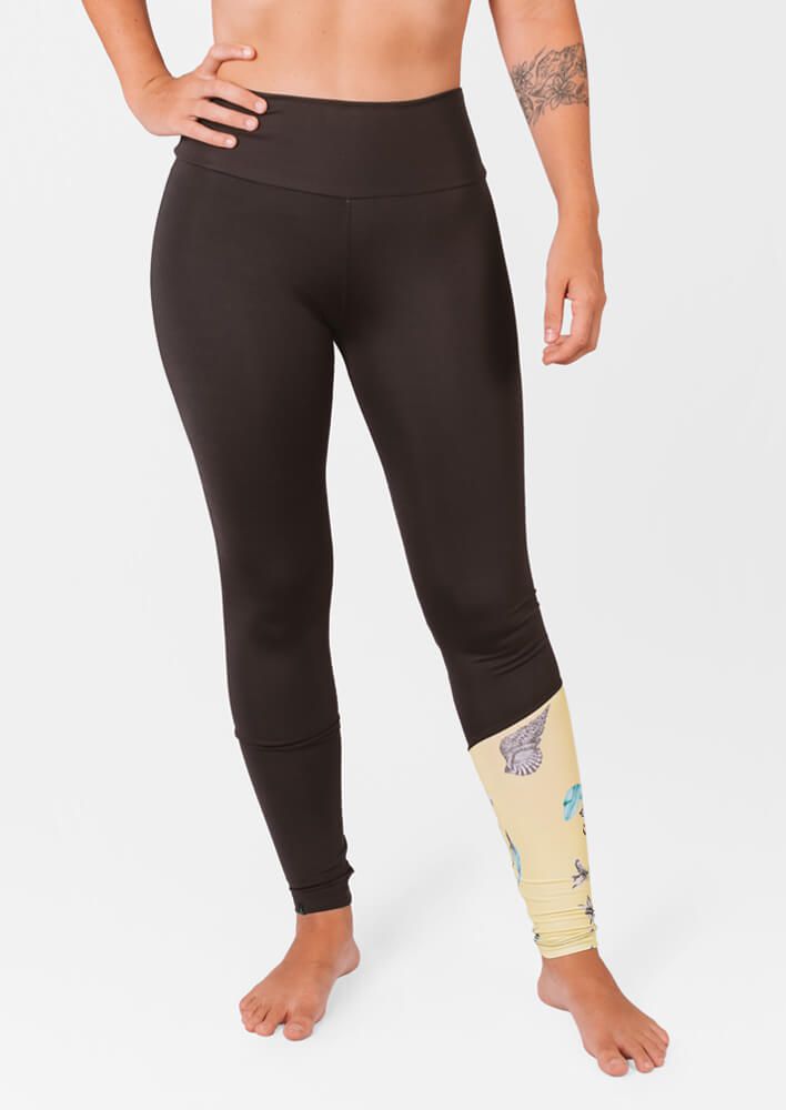 Legging preta com recorte na perna esquerda com a estampa floral amarela inspirada nas ilhas Maldivas, possui modelagem com o cós mais alto para ficar mais confortável durante os exercícios. Feito com tecido com compressão e não fica transparente. Perfeito para dar um surf, um rolé de skate, ir a academia, fazer yoga, dar uma corridinha ou ficar de boas, confortável em casa.