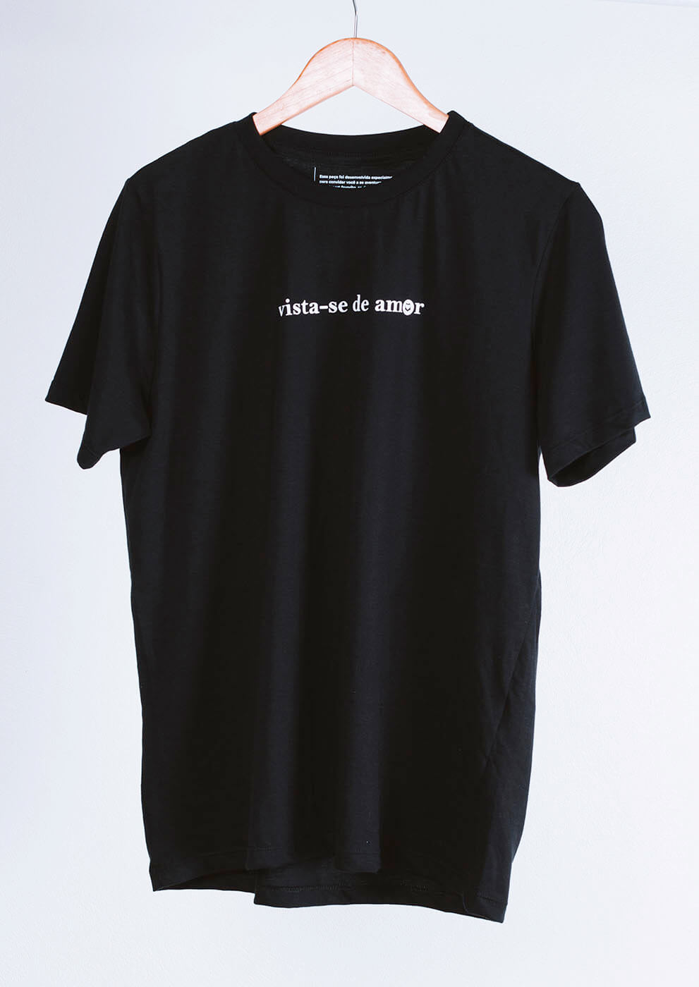T-shirt preta feita com meia malha 100% algodão com a estampa "vista-se de amor", que é como se fosse um slogan da nossa coleção, da nossa marca.