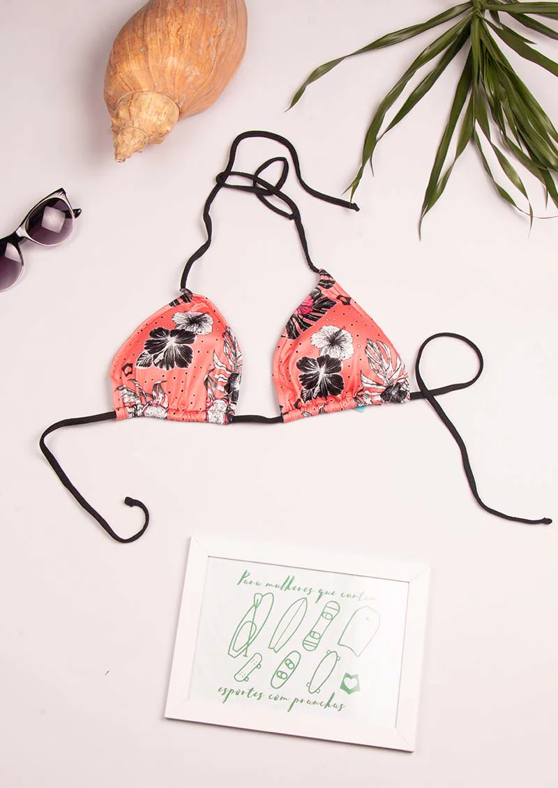Top de biquíni modelo cortininha estampado com as tirinhas de amarrar em preto que são super firmes e deixam com aquela marquinha linda de sol. Possui forro em preto e bojo removível para usar como preferir.