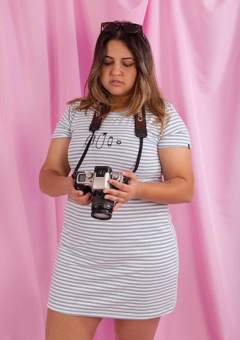 Vestido modelo mais básico, ajustado ao corpo e com mangas, feito em um tecido listrado branco e azul com algodão responsável, certificado pelo programa Algodão Brasileiro Responsável (ABR) da Abrapa, e o beneficiamento orgânico OrganOx®, que substitui produtos químicos perigosos preservando o meio ambiente.